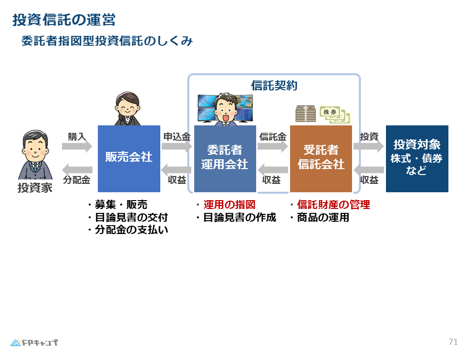 | 受託者(信託会社) | 投資家から集めた資産(信託財産)の保管・管理、委託者の指図に基づく売買の実行 |