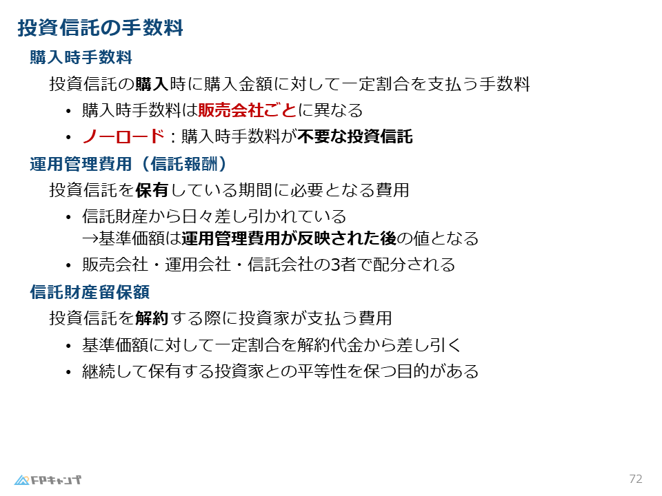 その通りです!特に長期運用を前提とする場合、信託報酬の差は将来のリターンに大きな違いを生みます。「購入時」「保有中」「解約時」の3つのタイミングでどのようなコストがかかるのか、この3点セットで覚えておけば、FP2級の試験対策は万全です!