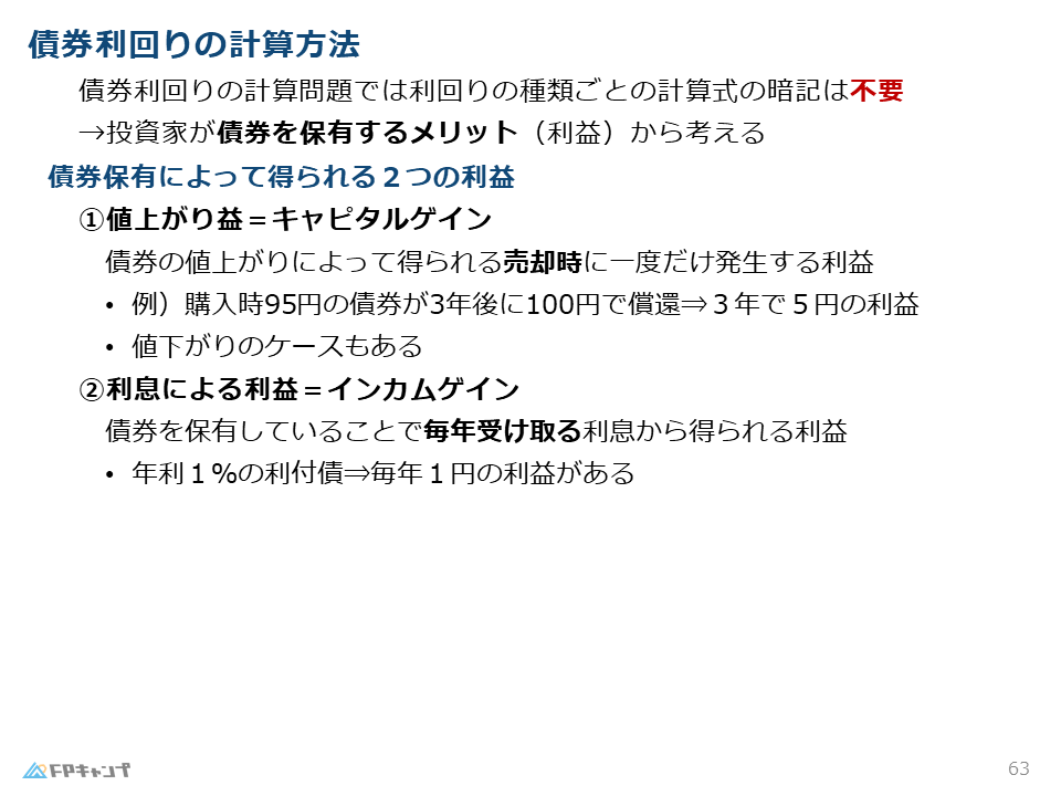 - 公式暗記は不要→「値上がり益」と「利息」の2つを理解する