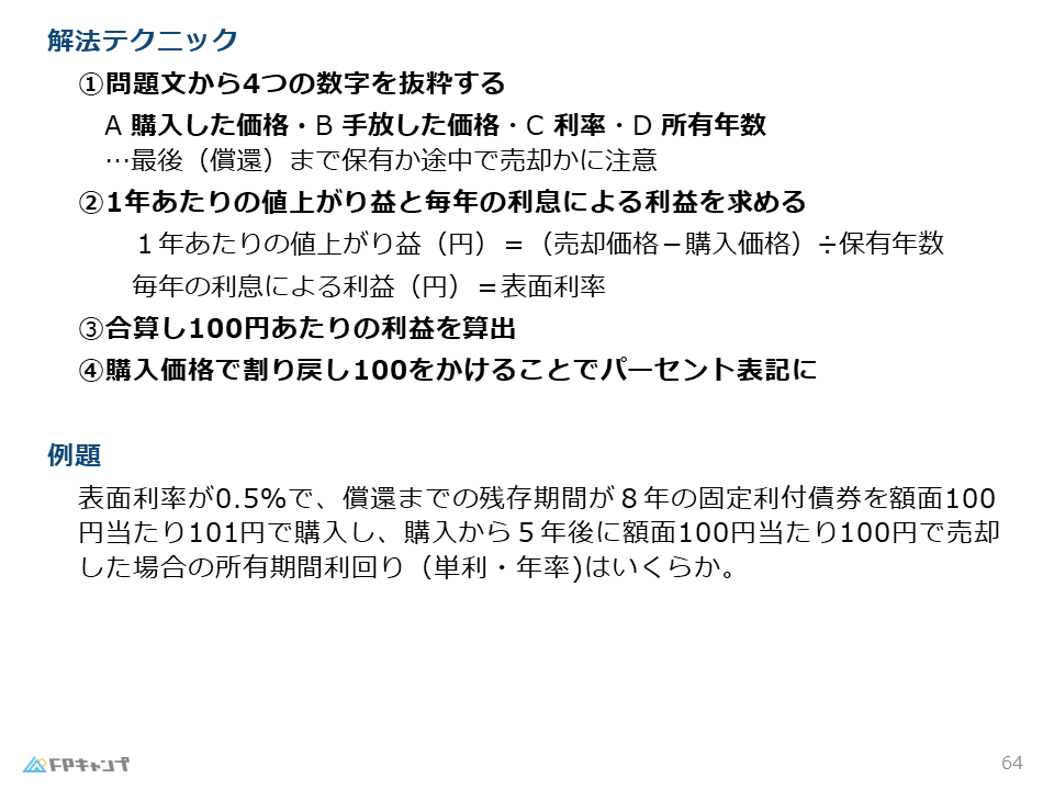 特に「所有年数」には注意が必要です。問題文に「残存期間」と「所有期間」の両方が書かれている場合がありますが、計算に使うのは実際にその債券を保有していた期間です。