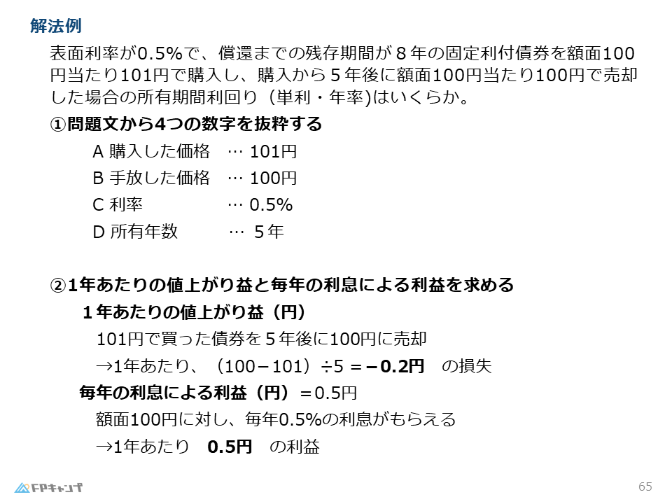 A. 値上がり益(今回は値下がり損):101円で買ったものを100円で売ったので、5年間で1円の損。これを1年あたりに直すと…