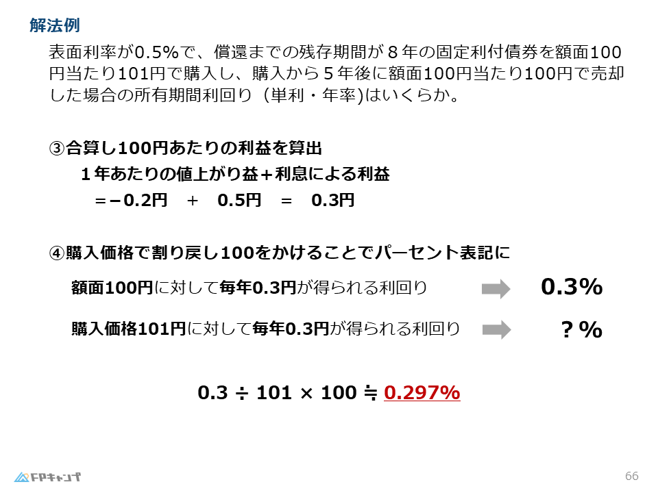 【例題】 表面利率0.5%で、発行時の残存期間が8年の固定利付債を、額面100円あたり101円で購入しました。購入から5年後に額面100円あたり100円で売却した場合の所有期間利回りを求めなさい。(小数点第4位を四捨五入すること)