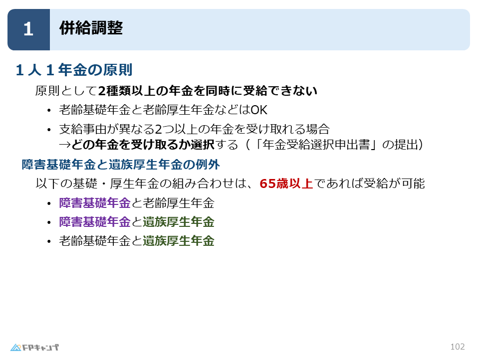 原則として「一人一年金」の考え方があり、どの年金を選ぶか(またはどの組み合わせなら併給できるか)が調整される仕組みになっています。