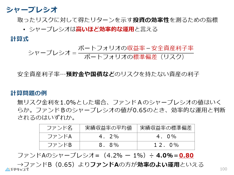 その解釈、素晴らしいです!シャープレシオは計算問題としても、用語の正誤問題としても非常に出やすいので、必ずマスターしておきたいポイントと言えるでしょう。