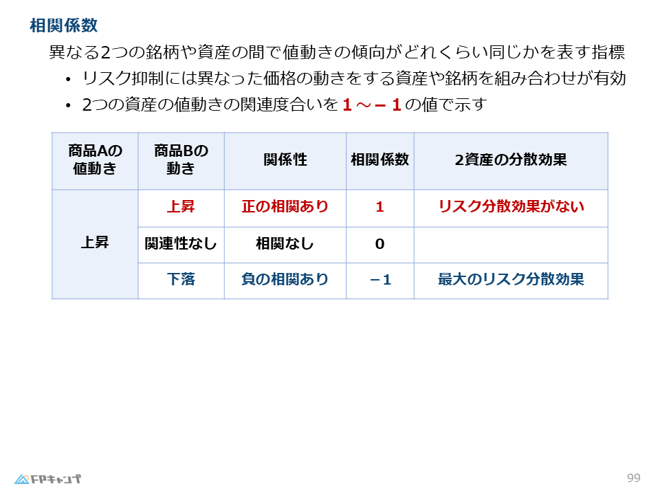 相関係数による分散効果の違い:1から-1までの数値の意味