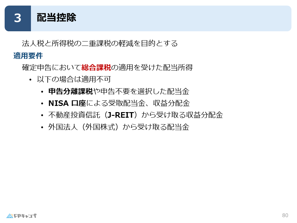 「配当控除率」「配当控除の対象となる所得」といった点が試験対策として非常に重要になってきます。