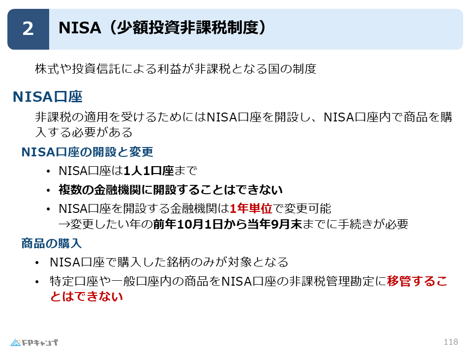 日付や期間はFP試験の定番問題です。次は、すでに持っている資産をNISAに入れられるかどうか、という「移管」のルールについて解説します。