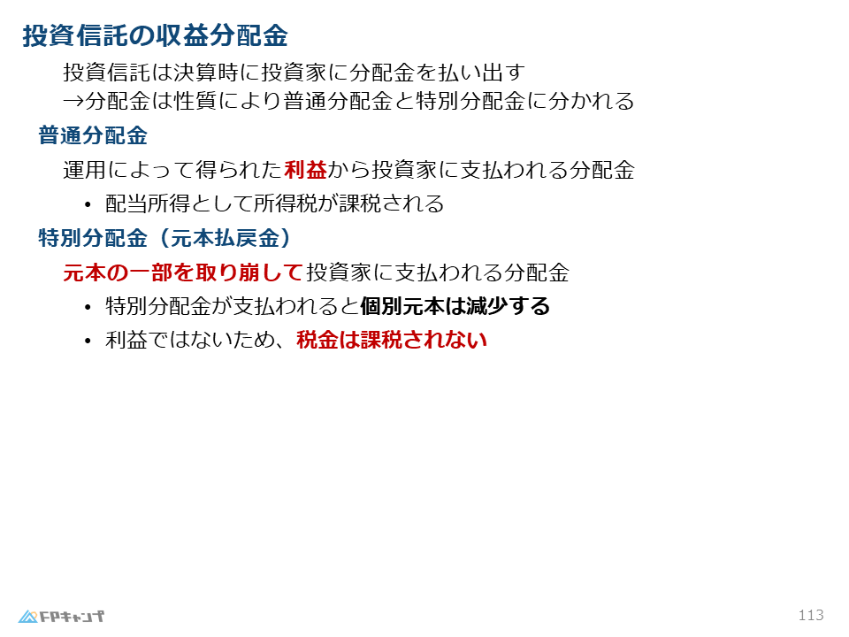 投資信託の分配金については、運用益から出る普通分配金は課税されますが、元本の払い戻しである特別分配金は非課税となります。