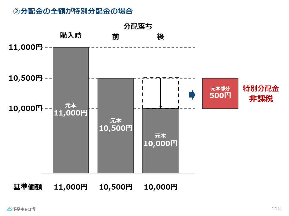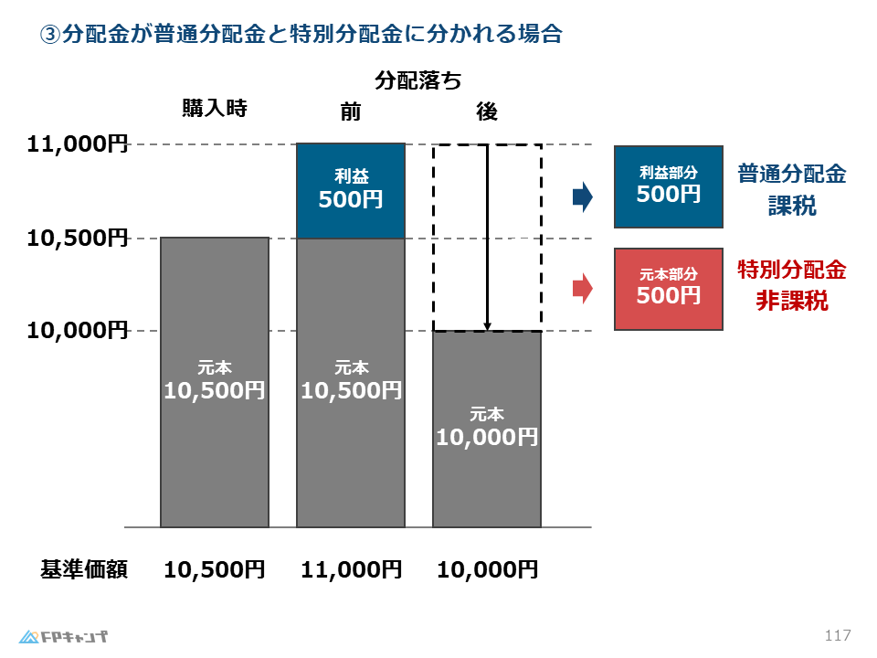 | 分配落ち後の基準価額 < 個別元本 | 個別元本を下回る部分が特別分配金(非課税) 残りの部分が普通分配金(課税) |
