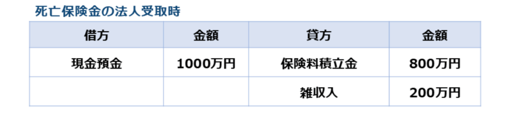 800万円の保険料積立金と200万円の雑収入が右側(貸方)に書いてあり左側(借方)の死亡保険金1000万円の内訳を表していることになります。