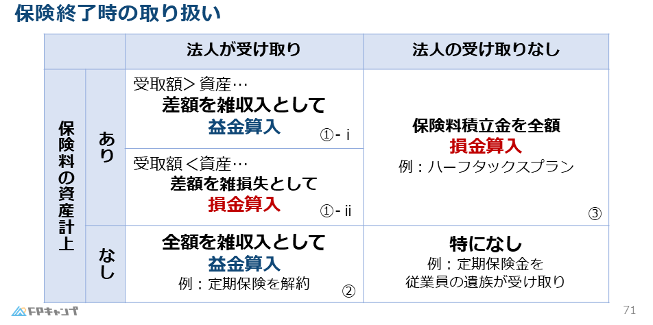 保険料を支払った時に資産計上として経理処理した金額より多くの金額を得たらその差額が利益、少ない金額を得たらその差額を損失として経理処理することになります。