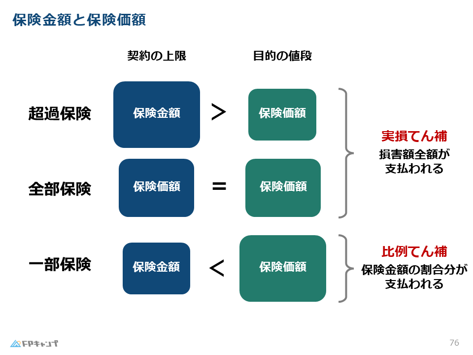 また、保険価格と保険金額の大小関係に関わる超過保険、全部保険、一部保険も理解しておいてください。