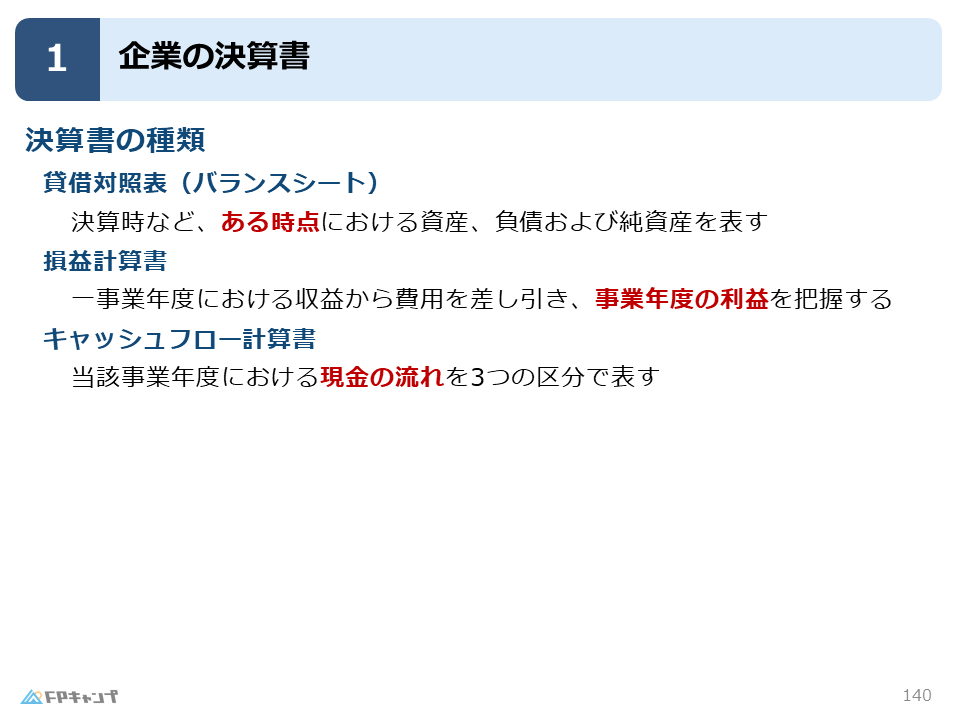 - 貸借対照表(バランスシート):ある時点における資産・負債・純資産の価値を表す。