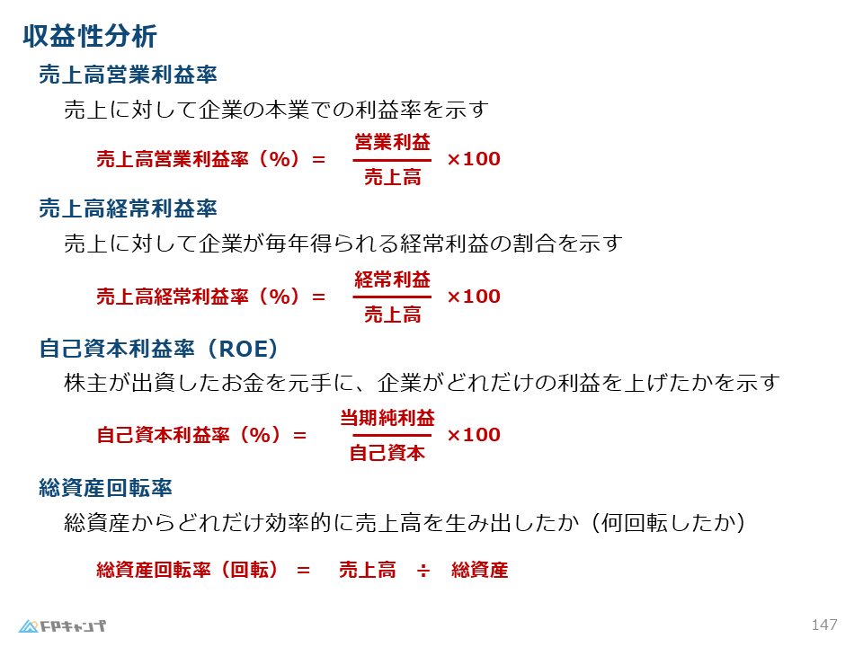 最後に、試験で問われやすい収益性分析の計算式を解説します。