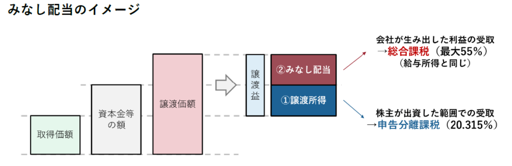 金庫株の課税関係は、資本金等の額と取得価額の差額部分は譲渡所得として、20.315%の申告分離課税になります。譲渡価額と資本金等の額の差額部分は、配当所得として、総合課税の対象となります。