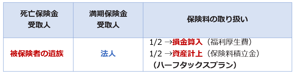 福利厚生プランとは、法人が養老保険に加入することで、従業員の死亡保障と退職金の準備を同時に行う制度です。また、税制上のメリットもあります。契約者を法人、被保険者を従業員、死亡保険金受取人を被保険者の遺族、満期保険金受取人を法人として加入することで、保険料の2分の1を損金算入することができます。