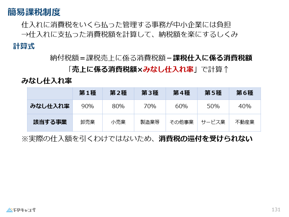 この制度では、実際の仕入れ金額は無視し、売上高に業種ごとのみなし仕入率をかけて、支払った消費税を計算したことにします。