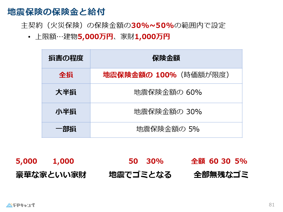 地震保険のかけられる保険金と給付される金額【試験で頻出です!】