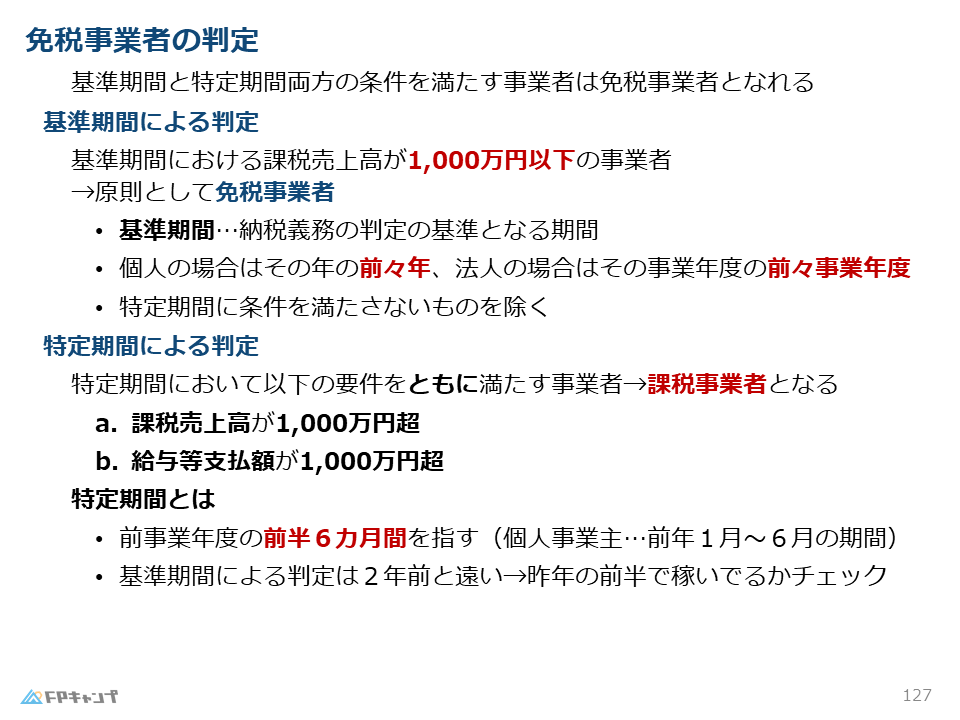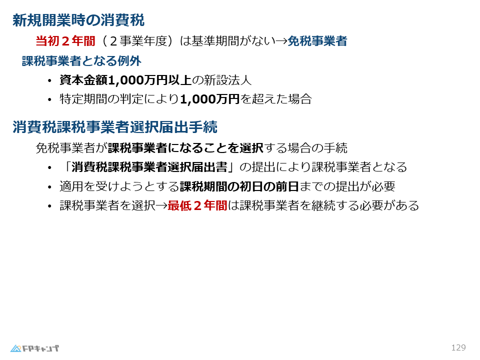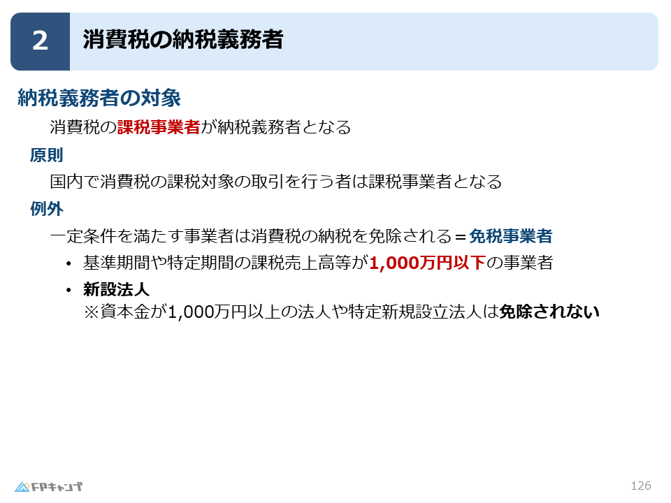 「免税事業者になるためには」「新設法人の課税の要件」といった点が試験対策として非常に重要になってきます。