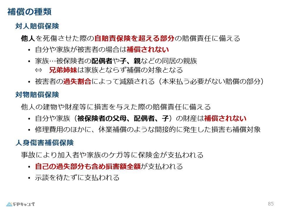 試験対策で大切なポイントは、自賠責保険と違って自分や家族が被害者の場合は補償されません。