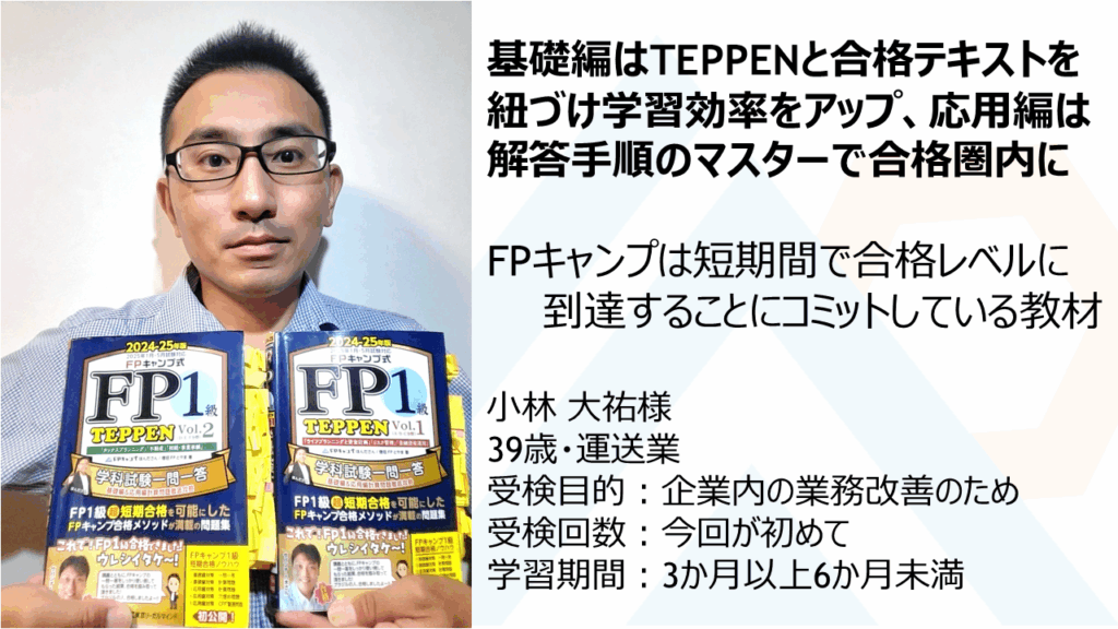 『FPキャンプ』『TEPPEN』『ビジネス教育出版社の合格テキスト』の3点セットのいずれか1つでも欠けていたら、自分は一発合格できなかったと思います。FPキャンプは短期間で合格レベルに到達することにコミットしている教材なので、正しい使い方で学習できれば、費用対効果は非常に高いと実感しています。