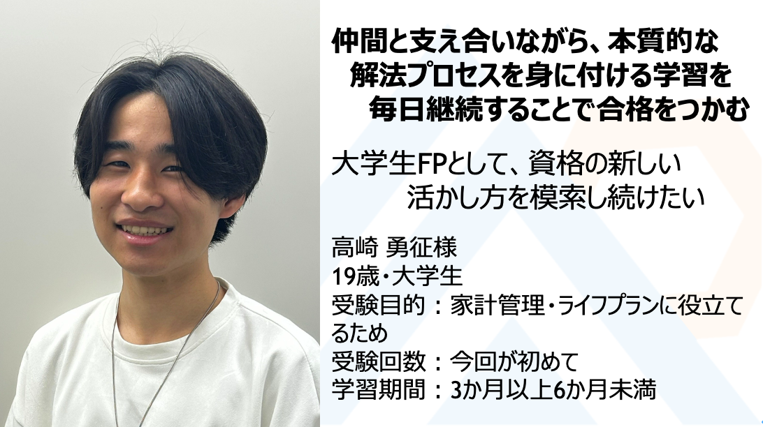 現時点では、FP資格を直接活かす場面はまだ多くありませんが、学んだ知識は今後の人生で必ず役立つと確信しています。特に、若いうちから知っておくべき制度や、早めに行動することの重要性を学ぶことができました。今後は、身につけた知識を自分の人生に活かすだけでなく、家族や友人にも良い影響を与えられるようになりたいと思います。また、大学生という立場を活かして、FP資格の新しい活かし方を模索しながら、さまざまなことに挑戦していきたいです。