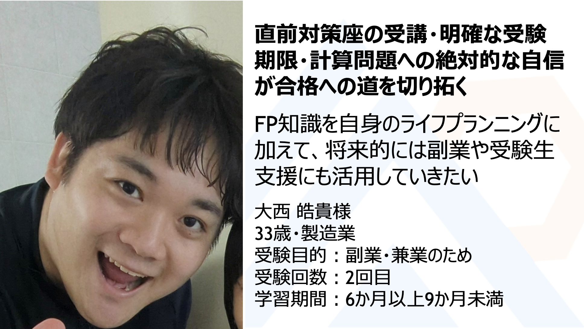 FPキャンプの直前対策講座でサトシ講師が紹介された「直前対策ノート」を試験1か月前から作成し、スキマ時間に繰り返し見返すことを習慣化しました。知識をノートに整理・集約することで頭の中がクリアになり、体系的に理解できるようになったことで記憶の定着にもつながりました。試験当日には、サトシ講師が語っていた「試験開始の合図と同時にコップに水一杯となる」状態で臨むことができたと感じています。