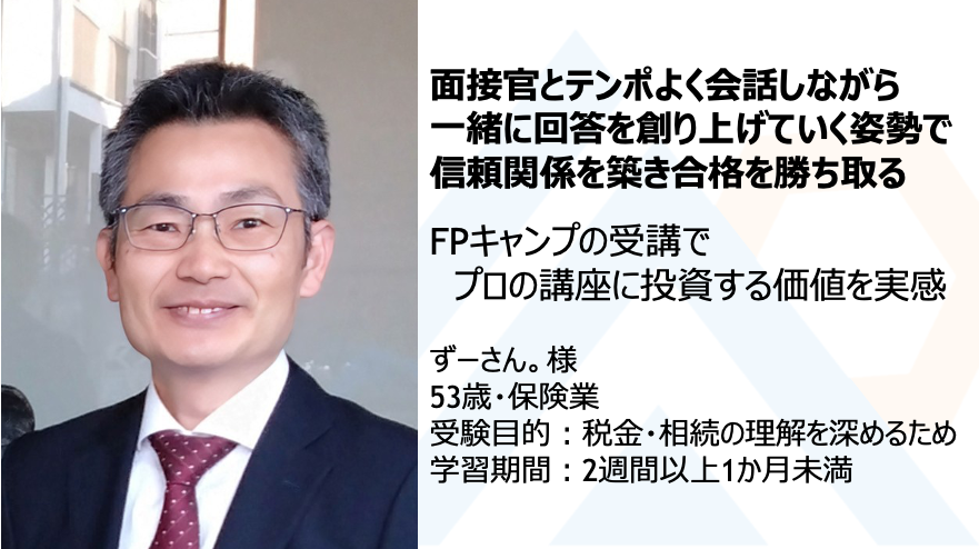 開始時期は遅れましたが、動画視聴と過去問演習(FPキャンプ教材)を重点的に取り組みました。テキストの想定問答は、要点を簡潔に答えられるよう練習し、さらに「自分の言葉で説明する」練習も重ねました。この練習のおかげで、どんな角度から質問されても自分の考えを伝えられるようになったと思います。