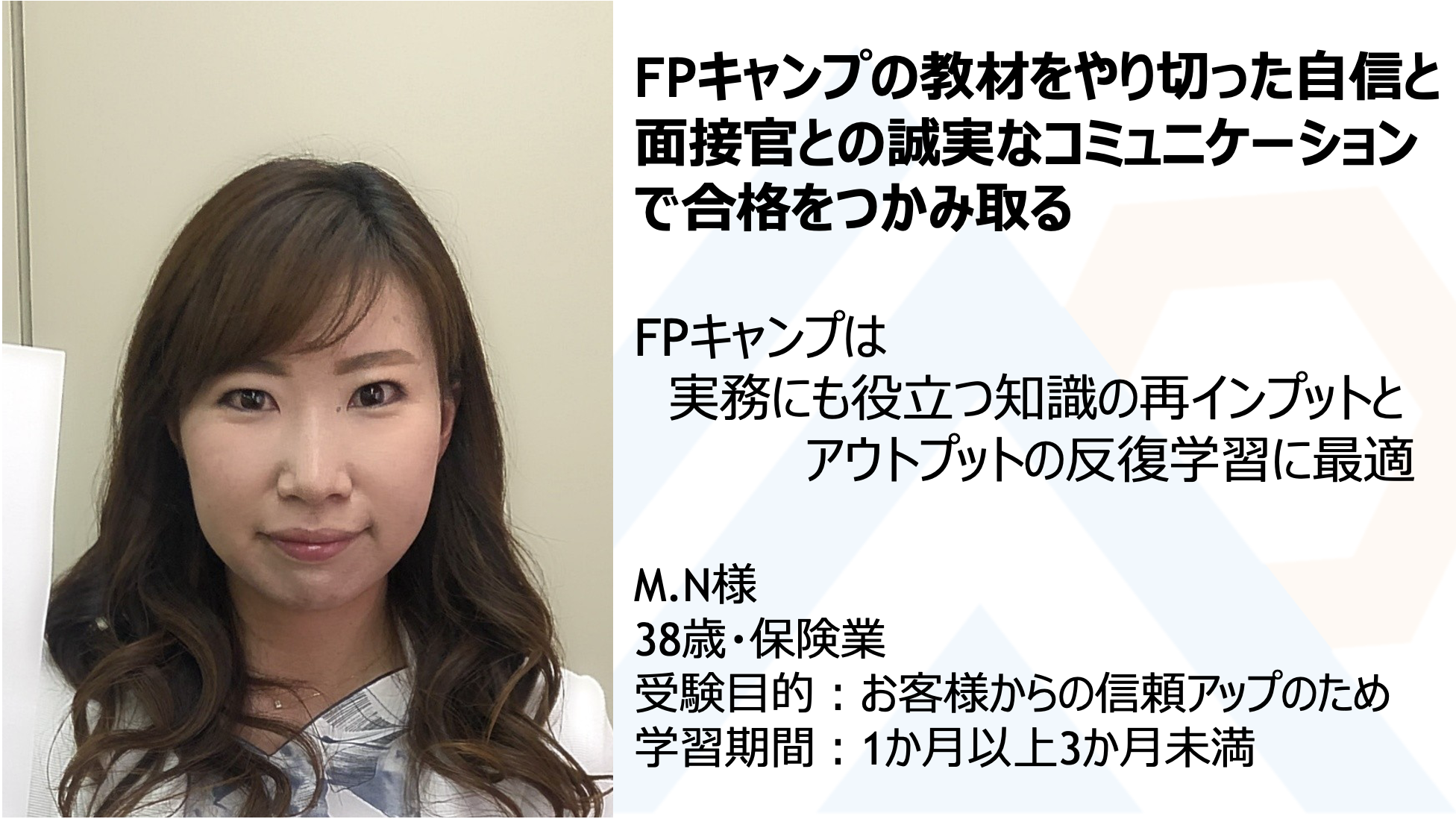 FPキャンプの教材を徹底的に活用したことが最大の要因です。範囲が広く不安はありましたが、講義で学んだ「事前準備のフロー」を本番で再現できたことが大きな強みになりました。設例を読む15分間で最低限の回答を準備できたため、面接で回答に詰まることがありませんでした。